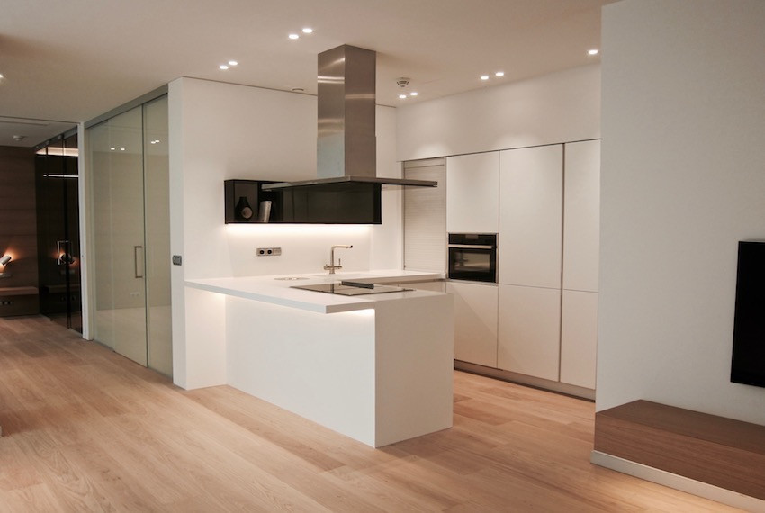 La zona de estar, el comedor y la cocina comparten el espacio común del primer plano de la vivienda manteniendo un grato equilibrio. La tarima de madera de roble blanqueado, el gres porcelánico y el Corian blanco y negro para los revestimientos continuos de la cocina, son los materiales básicos que conforman el nuevo interior.