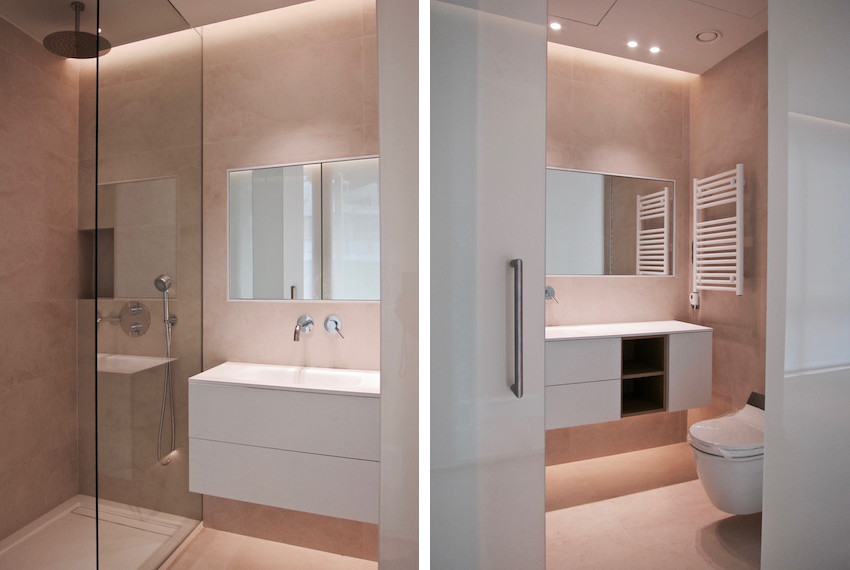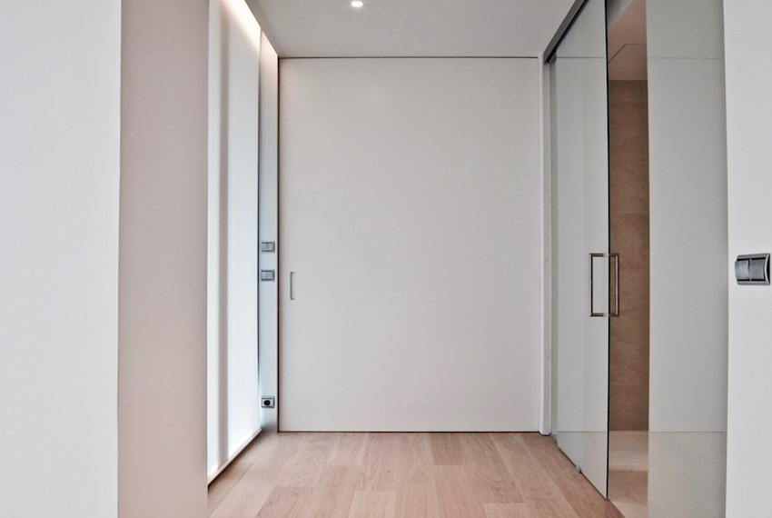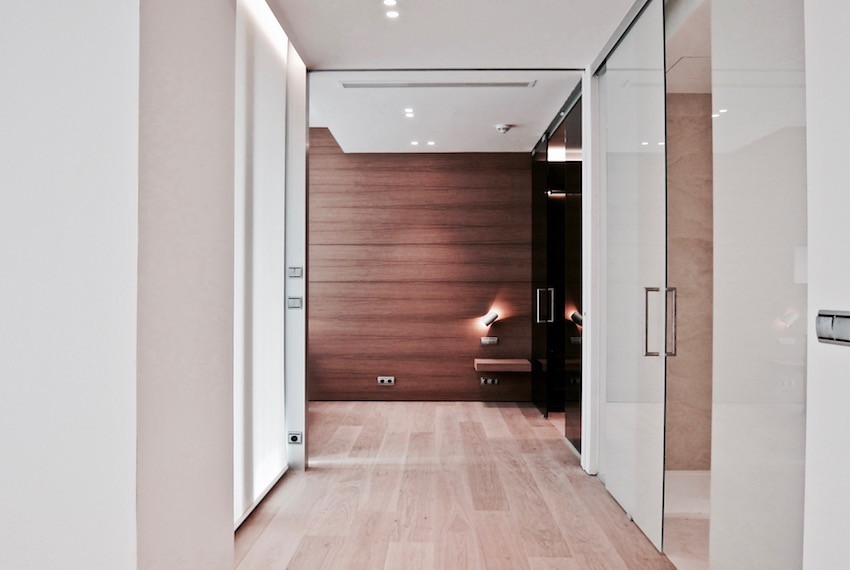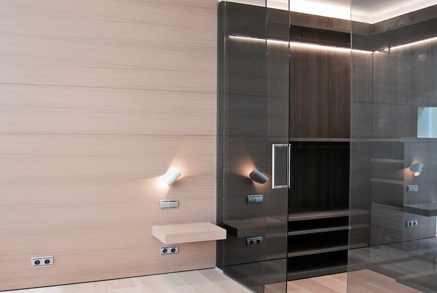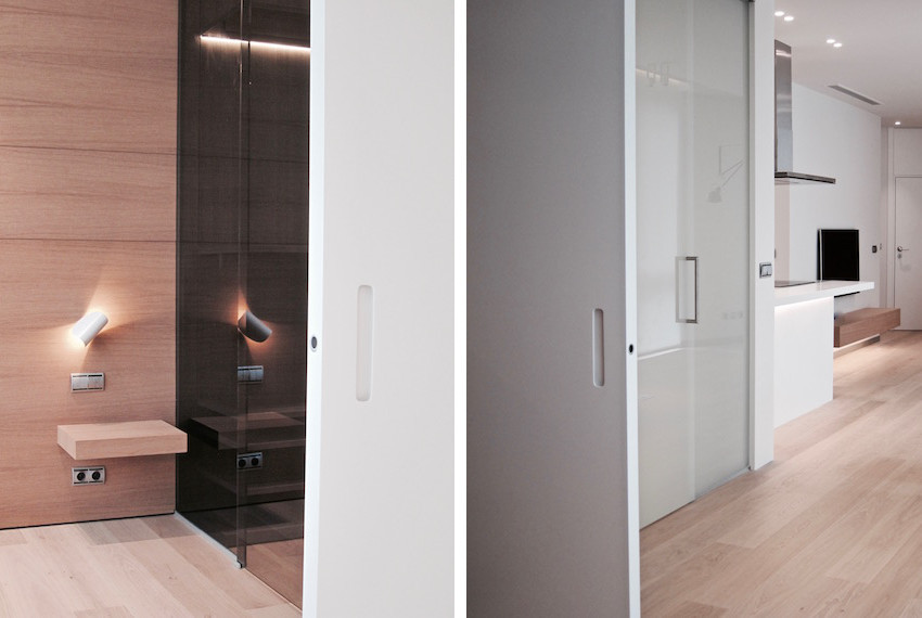 El espacio que ha generado la nueva propuesta permite visualizar integramente toda la vivienda. La transformación es posible privatizando la habitación por medio de un panel corredero oculto. El baño está protegido con lunas de vidrio laminar translúcido y el vestidor por medio de vidrio laminar transparente gris, ello permite el paso de la luz natural y el orden visual de cada una de las estancias.