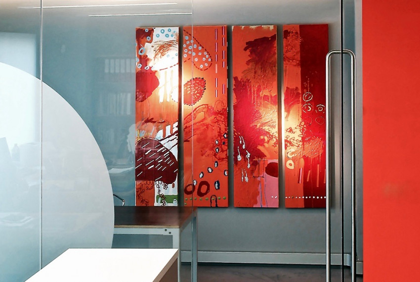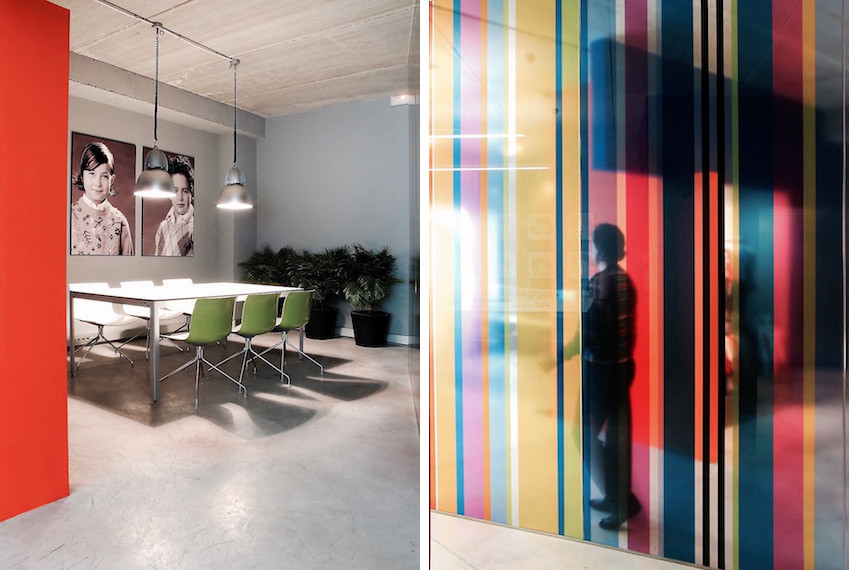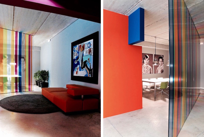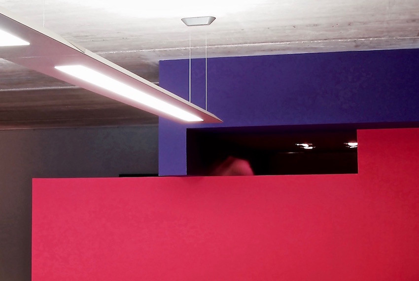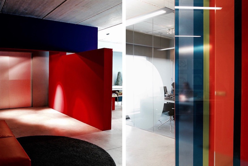 La paleta de acabados la componen, el hormigón continuo como elemento básico unificador, la madera de ébano, aluminio anodizado. El color es el protagonista en los volúmenes entrelazados del acceso y en el paramento de vidrio que privatiza el espacio de reuniones.