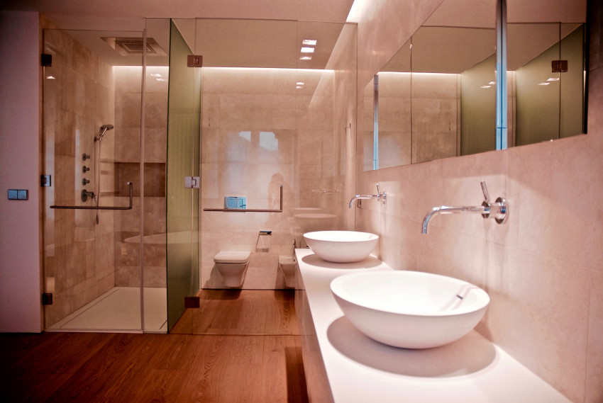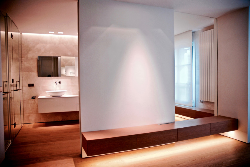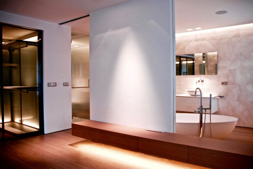 La habitación principal con acceso desde el estudio biblioteca dispone de vestidor y baño integrado. La solución permite unificar visualmente el dormitorio, el baño y el vestidor, que mediante cerramientos parciales de vidrio transparente u opaco pueden aislar cada uno de los ámbitos.