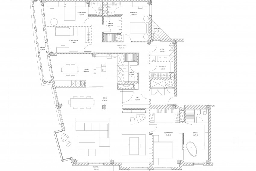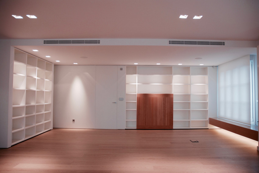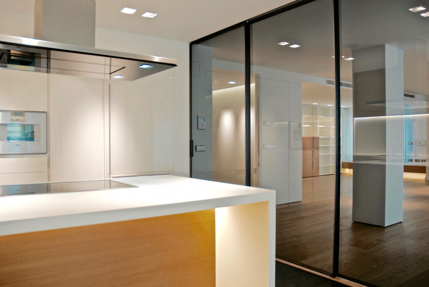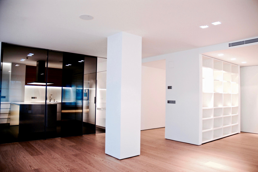 La zona común, de unos 112 m2 la componen la cocina, el comedor, la zona de estar y el estudio biblioteca, que se disponen en un volumen diáfano, donde unicamente la cocina permite aislar su espacio por medio de paneles correderos de vidrio.