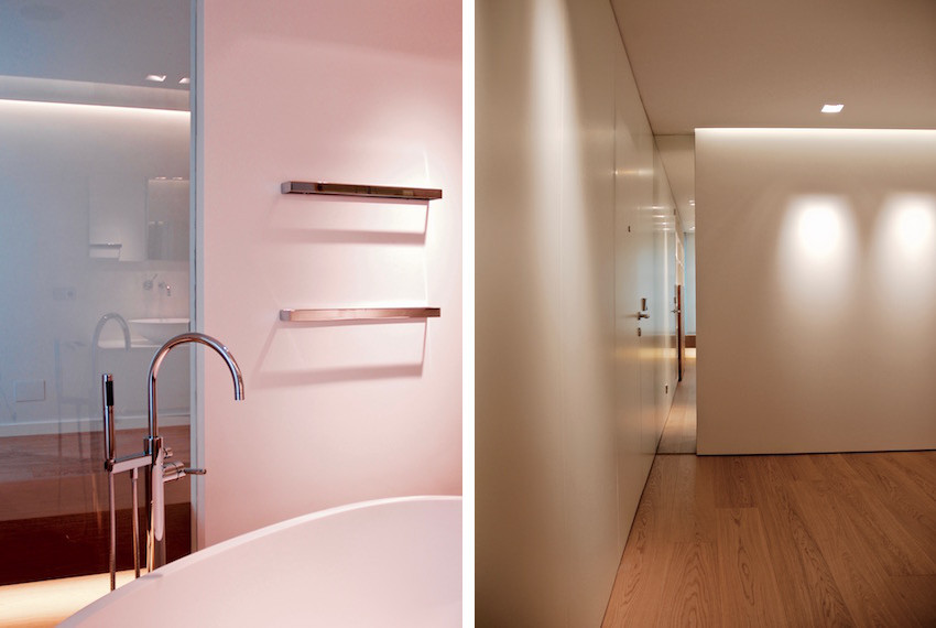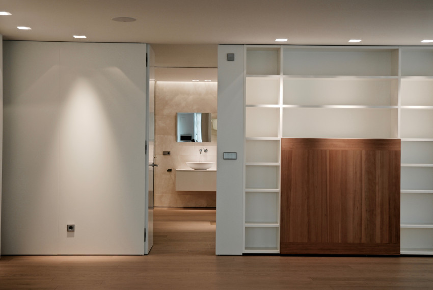 Los acabados se perfilan con tonos suaves y neutros como la madera de roble blanqueado junto a los encuentros de paramentos verticales blancos lacados que integran las puertas de paso.