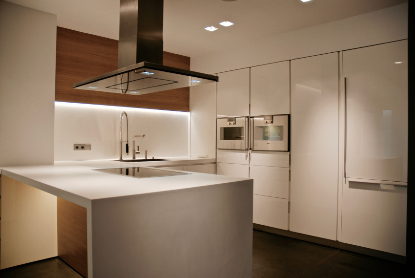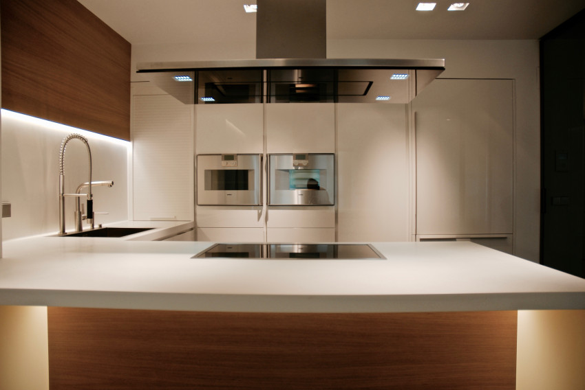 Materiales de agradables texturas como la piedra Crema Real se muestran entre acabados cálidos como el roble o mas actuales como el Corian Blanco Glaciar y el roble teñido gris. El conjunto del proyecto con marcadas pautas minimalistas pretende ser acogedor dentro de una minuciosa austeridad.