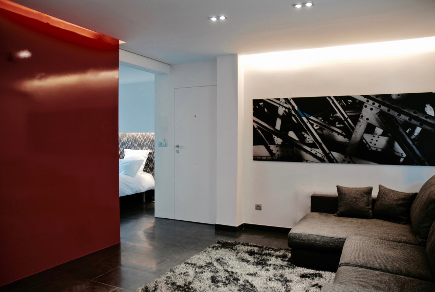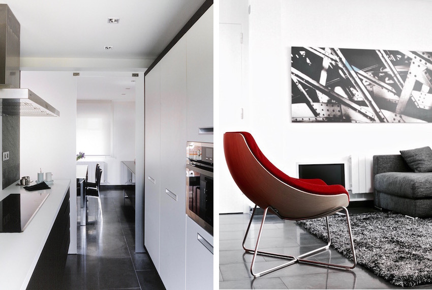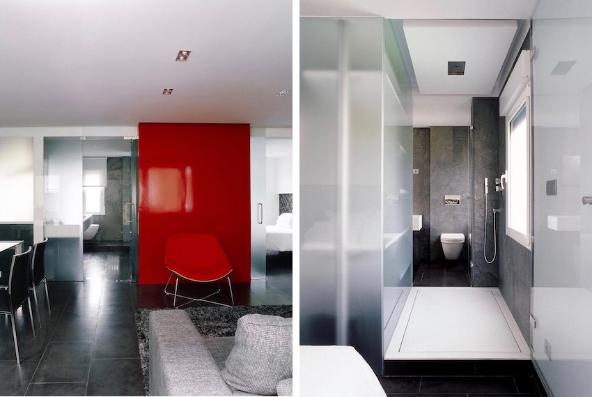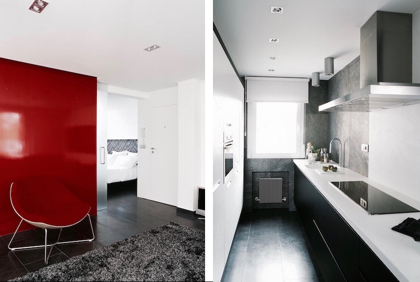 La paleta de materiales la componen el gres porcelánico gris, que se entremezcla con la cuarzita acero gris de los paramentos y con madera de wengé, además del Corian Blanco Glaciar en la cocina y el baño. El paramento rojo en la zona de estar atrae la mirada e imprime carácter a todo el conjunto.
