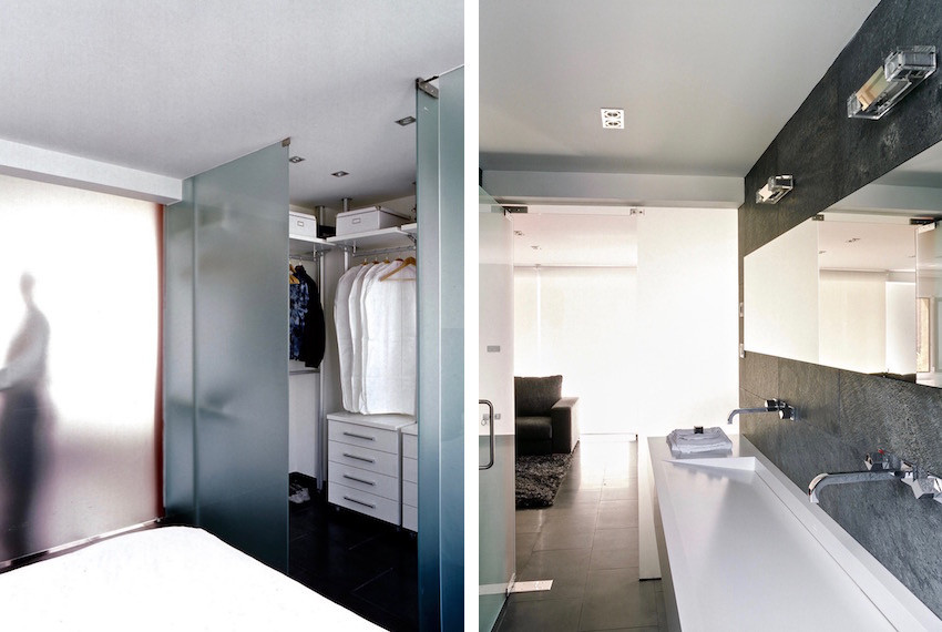 Los cierres que dividen los espacios están tratados con vidrio laminar translúcido para permitir el paso de la luz y hacer posible la comunicación o privacidad en cada una de las estancias.