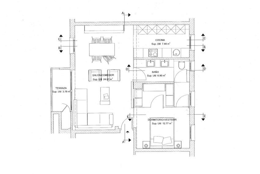 La intervención se lleva a cabo sobre una superficie de planta de 50 m2. El espacio donde se perfila la nueva distribución se compone de una zona de estar/comedor y otra más privada que organiza la cocina, el baño y la habitación principal.
