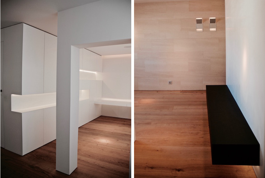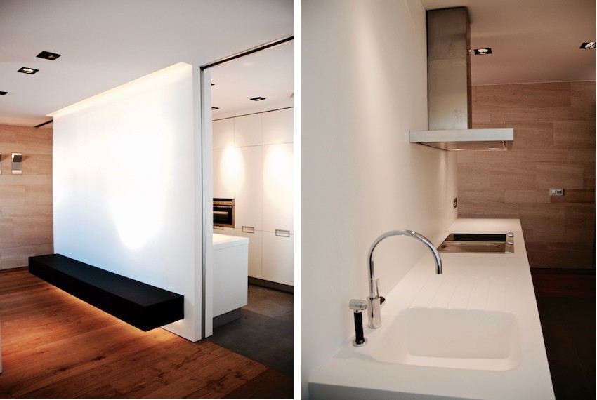 Dentro de la austeridad del proyecto, un muro de división integramente revestido en Corian blanco privatiza la cocina y soporta un elemento lineal en madera de wengué hacia la zona de estar.