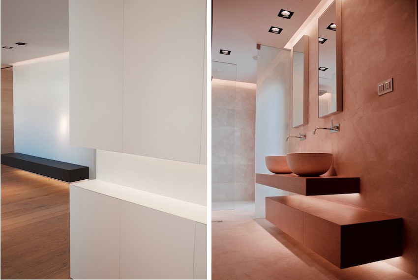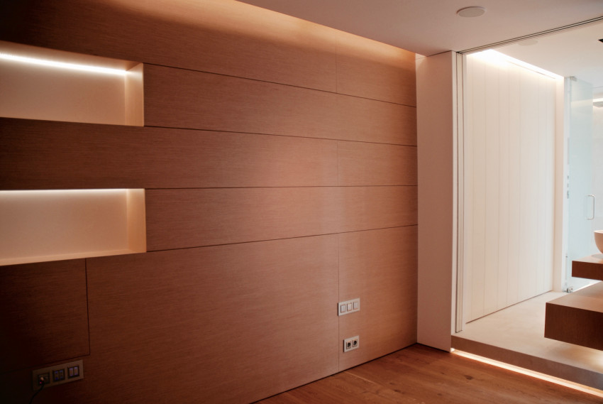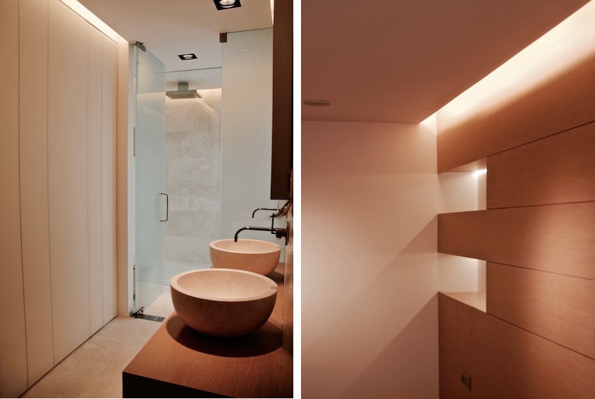 La habitación principal dispone de un baño integrado que permite su privacidad por medio de paneles correderos ocultos de vidrio blanco opaco.El baño con un marcado caracter escultórico, combina piezas suspendidas de roble con revestimientos y lavabos en mármol Crema Real Bianco.